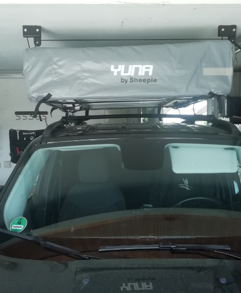 jupp, normalerweise sind das Seilzüge für E Bikes (Link angehängt). Kosten für beide < 50 Teuronen. Der Vorteil: Ich kann das Dachzelt alleine auf den Renni hieven.