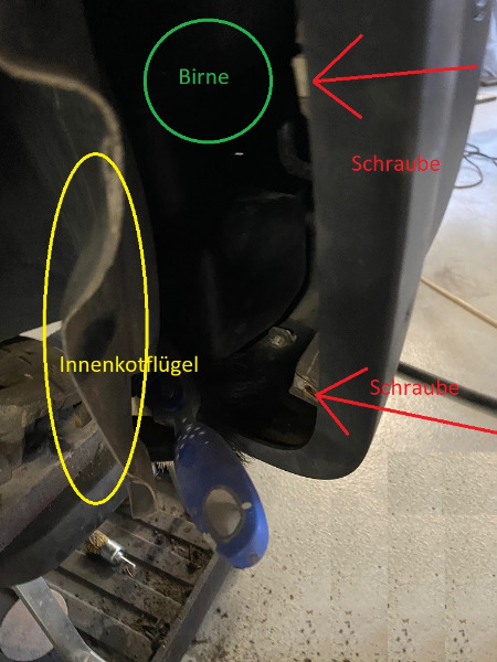 Also ich habe dazu die unteren beiden Schrauben des Innenkotflügel gelöst und dann den Innenkotflügel zur Seite gedrückt. Dann startet etwas Fummellei, denn die originale Birne will nicht so einfach raus. Sie ist oben und unten mit Fanghaken gesichert, gräftig ziehen dann ging es.