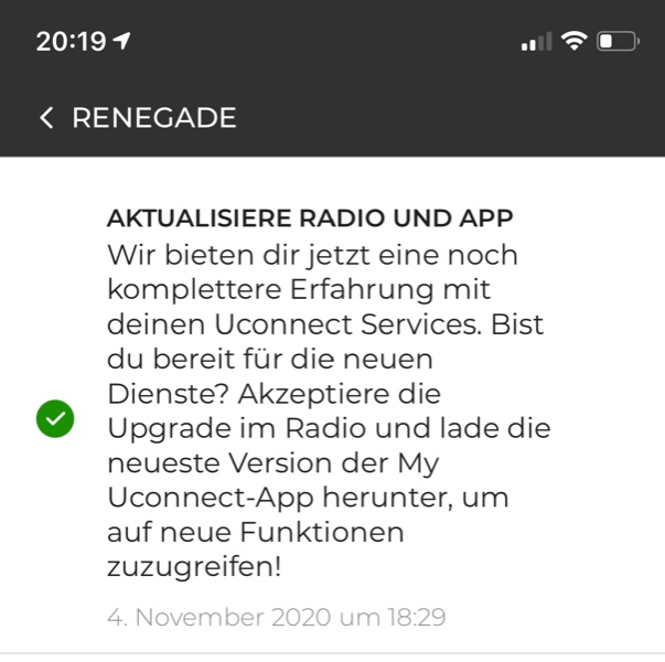 ...ist schon seit ca. 1 Woche so, solange mir aber im Uconnect die Liveservices nicht zur Verfügung stehen hilft das alles nix, ich überlege gerade wie das zu werten ist, daß es Ablaufdaten der Services gibt wenn es noch gar nicht angefangen haben zu funktionieren...
