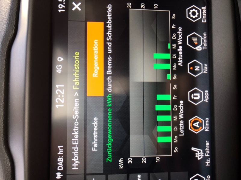 ) also 10km zum Pizza holen oder so, dann bleibe ich im E-Modus.Laut Uconnect-Statistik fahre ich ziemlich genau 2/3 der Strecke elektrisch, 1/3 mit Sprit und rekuperiere 10kw pro Tag. Ich nutze immer den stärkeren Rekuperationsmodus, weil ich das beim Fahren sehr angenehm finde. Spritverbrauch overall wird angezeigt mit 4.3 Litern.