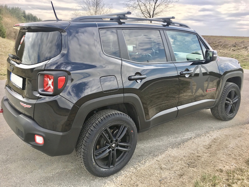 Radtechnisch also die „light“-Variante, da diese Reifengrösse freigegeben ist und keiner weiteren Umrüstungen (Tachobox, etc.) bedarf. Der AT-Reifen erscheint deutlich voluminöser als sein 18-Zoll Strassen-Pendant und gibt immerhin noch ein paar zusätzliche mm her. Zusammen mit dem Lift habe ich dann ungefähr 35mm Höhenzuwachs. Mir war hauptsächlich die Optik ein Anliegen und zusammen mit Thule Körbchen habe ich das Quentchen „Rock'n Roll“ am Auto was mir bisher fehlte.