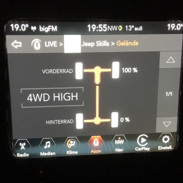 Die Pich & Roll Anzeige gibts bei mir gar nicht. Ich kann sie aber kurzfristig aktivieren indem ich das System (u-connect) platt mache und neu lade. Dann erscheint die Anzeige kurz aber ohne Funktion und wenn ich das erste mal wieder online gehe ist sie wieder weg