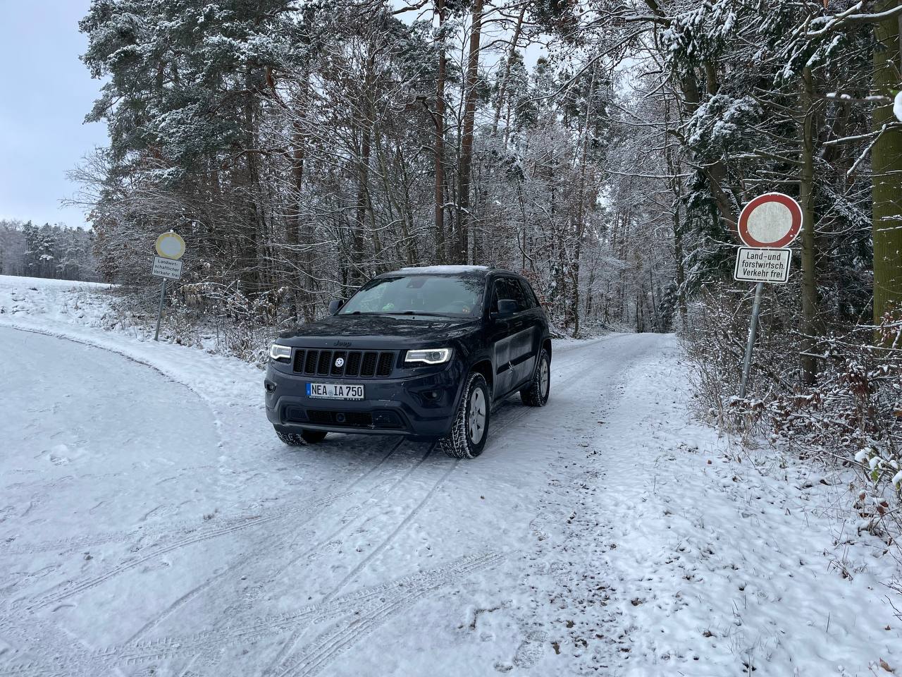 GRNIS; vom Walde geflogen, denke ich, gefahren wird teuer, überall Verbotsschilder, ich finde es gut, wenn dein Jeep fliegen kann hohoho