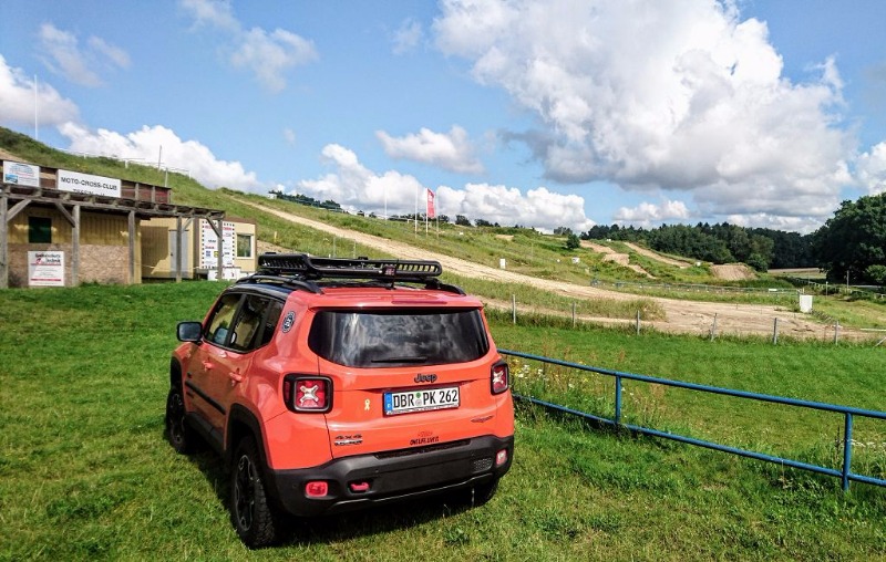 Jeep Renegade Trailhawk 2,0 D mit 170 PS und 9 Gangstufen Automatik, Omaha Orange, ROLA Dachkorb Sandbleche + Bergegeschirr nach Lage. Trekfinder Federn (plus 3cm), Spurplatten 5mm, AT-Reifen 225/65 R 17, Zusatzscheinwerfer vorne / hinten am Dachkorb, Reserverad "on top".