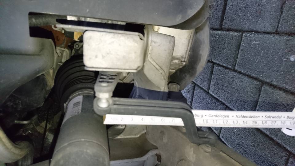 Die Ursache war schnell gefunden: Am vorderen Leuchtweitenregler fehlt zwischen Sensor und Tragarm ein kleiner Plastikhebel, welcher den Tiefgang des Cherokee zum Sensor überträgt.