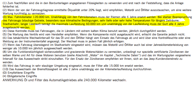 • Also wenn ich die Bedienungsanleitung richtig interpretiere muss nur beim 1,4er der Zahnriemen gewechselt werden und bei MyJeep im Wartungsplan für mein Fahrzeug kann ich auch keinen Zahnriemenwechsel finden.
