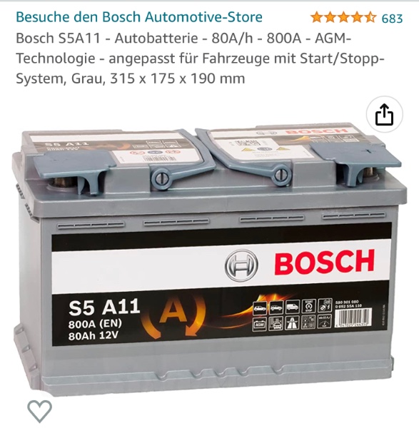leider finde ich bei diversen online-Batterieanbietern KEINE passende Batterie für meinen KL, 1004, AEJ. Sowohl die Bosch-, als auch die Varta-Batteriesuche auf deren Seiten liefern Ergebnisse für Batterien, die 394 mm lang sind und NICHT in mein Auto passen. Da wären 300 mm das Maximum. Aktuell ist eine „CAR1 AGM 800“ verbaut (vom Vorbesitzer) mit 800 A, 80 Ah. Ich würde diese gerne durch eine Varta- oder Bosch-AGM ersetzen, weil die No-Name-Batterie schwächelt. Kann jemand helfen?